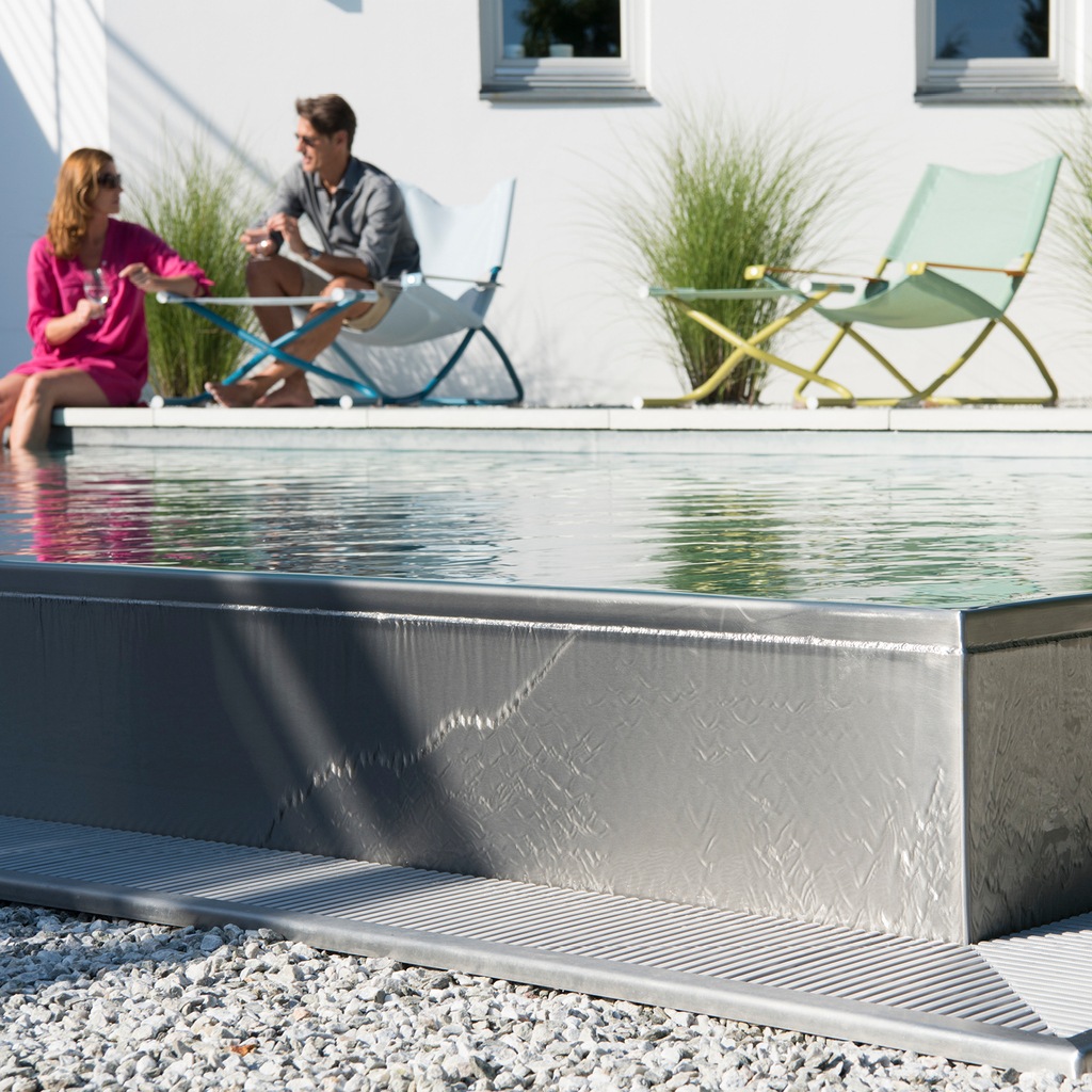 komplette Gartenumgestaltung | großzügige Terrassen | großformatige Sichtbetonplatten | Outdoorküche | Outdoorkamin | Edelstahlpool | Pooltechnik | Wasserbecken | Pergolen aus Stahl & Holz | WertBaum-Pflanzung