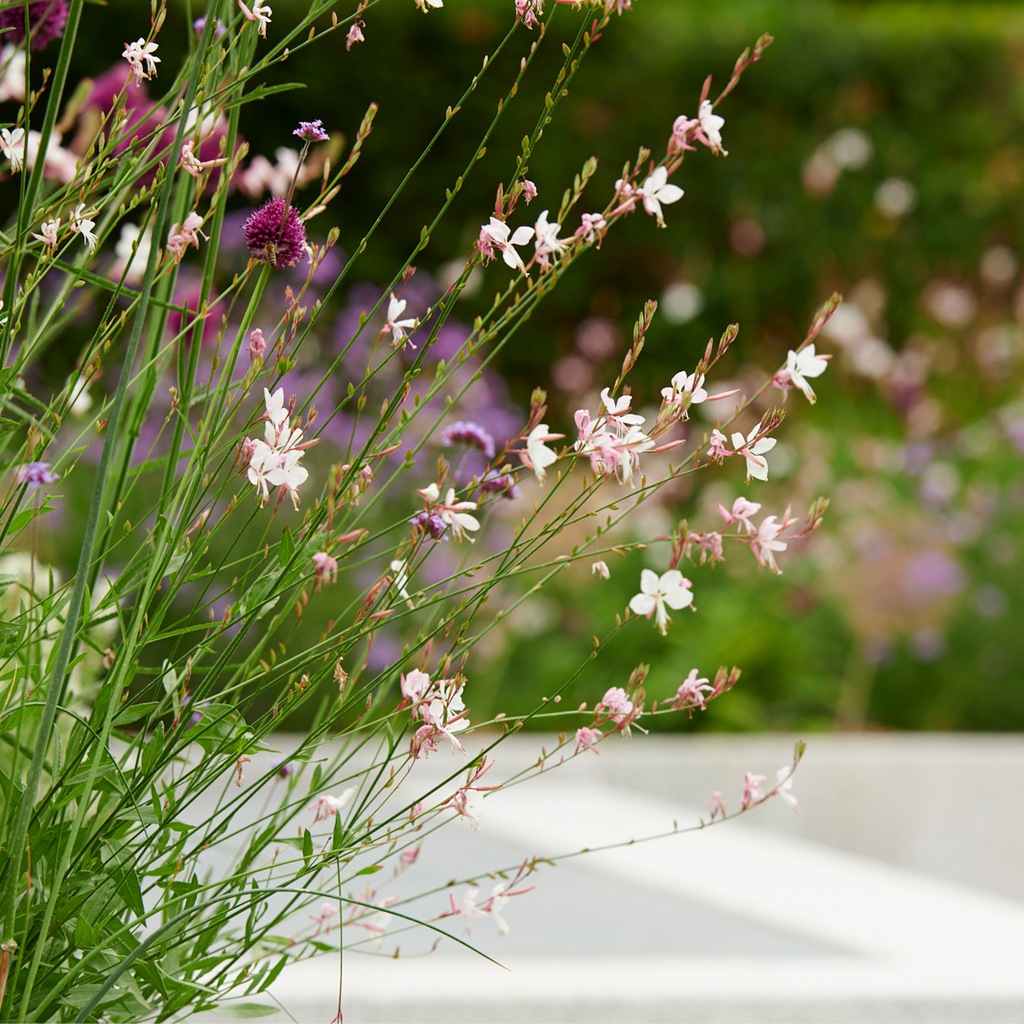 Gartensanierung | Terrassen aus großformatigen Feinsteinzeugplatten und Holz | Natursteinelemente | Wasserspiel | WertBaum-Pflanzung | Bewässerungsanlage | Gartenausstattung
